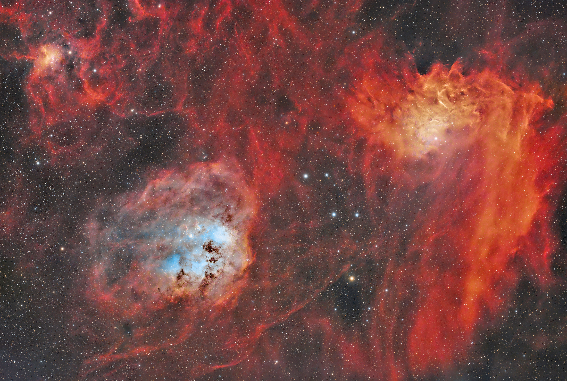 Astrofotografía del trío de nebulosas de la Estrella Llameante (IC 405), Nebulosa de los Renacuajos (IC 410) y la Nebulosa de la Araña (IC 417), situadas en la constelación de Auriga.