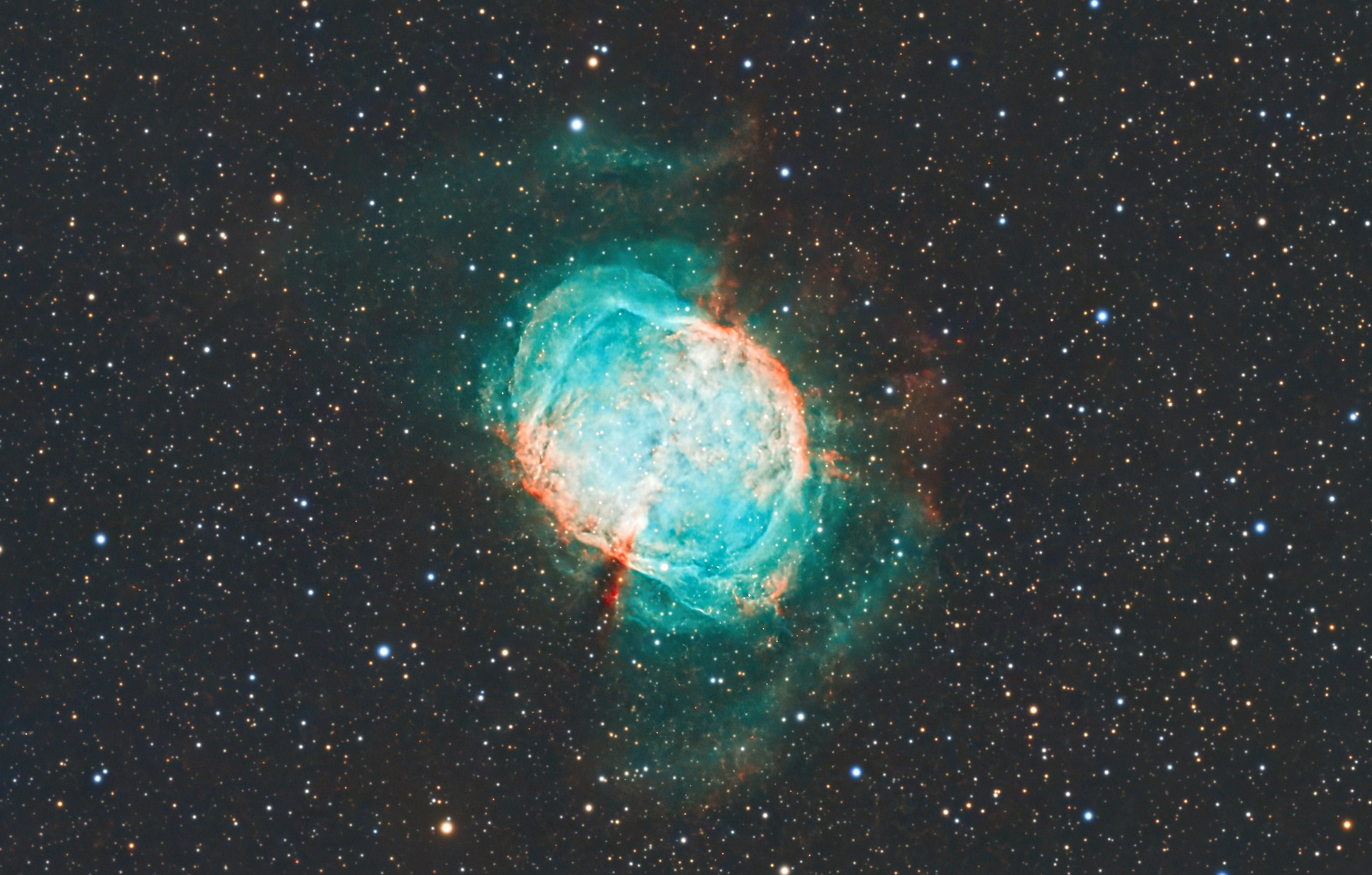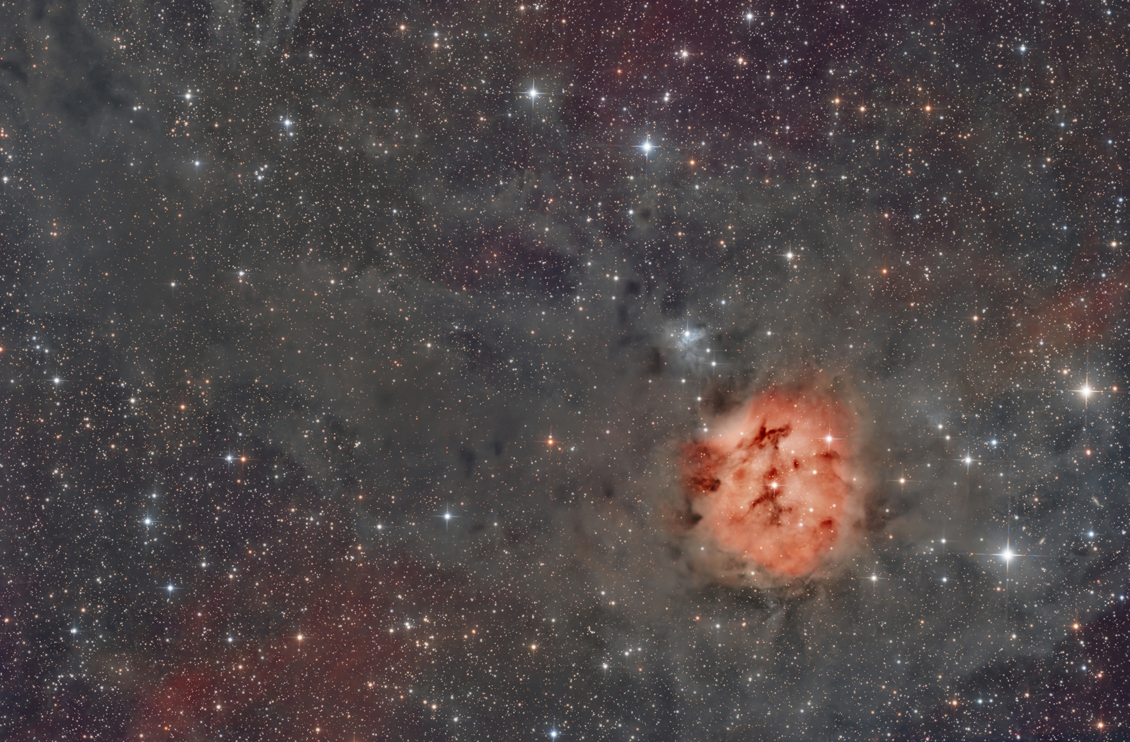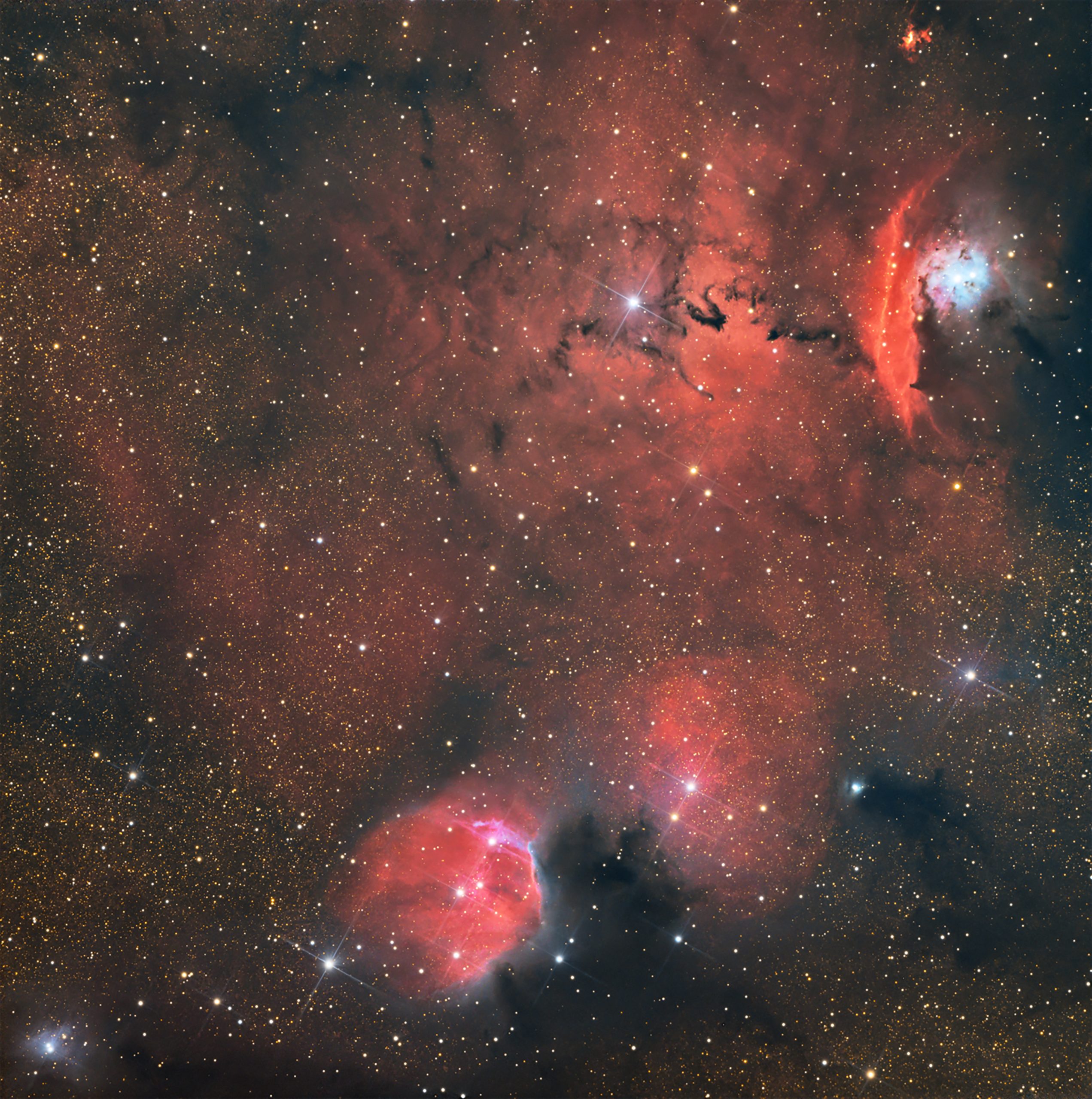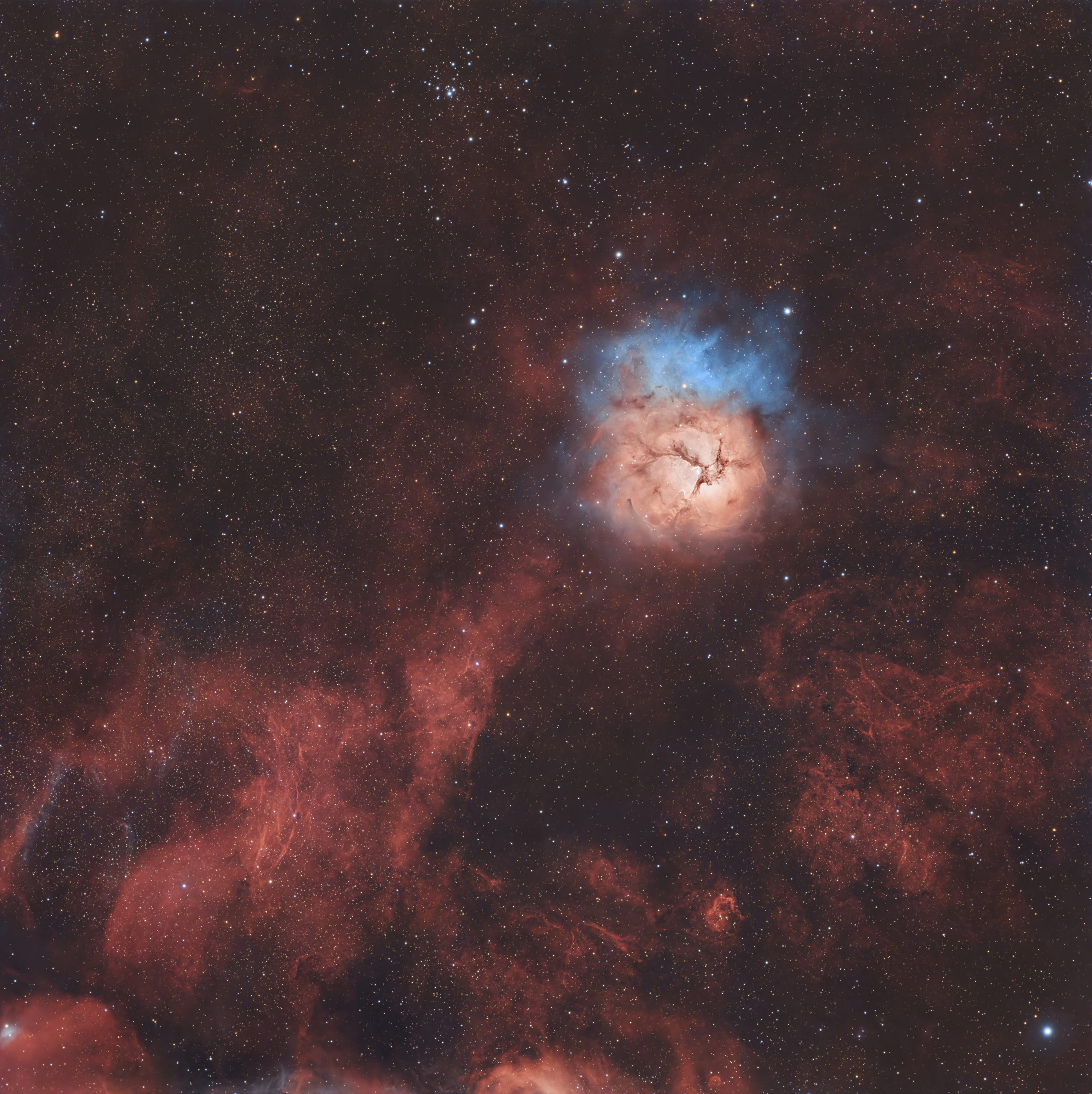 Toma de gran campo de la Nebulosa Trífida M 20 en Sagitario. Su autor, Ángel David Arévalo Flor, de Córdoba, nos escribe: «Son 22 horas de tiempo total de integración capturadas desde la terraza de mi casa (Bortle 9) y dos farolas justo a mi altura en la segunda planta me tienen frito. Para conseguir obtener algo desde un cielo con tanta contaminación lumínica es necesario mucho tiempo de integración. Equipo utilizado: TS Optics Photoline 80 con reductor aplanador Photoline 0,79x y cámara ZWO ASI 533. Filtro Svbony sv220. Como tubo de guiado tengo el Evoguide 50 con la cámara ZWO ASI 120 MM mini. La montura es la Sky-Watcher EQ6R Pro y todo ello controlado por AsiAir plus.»