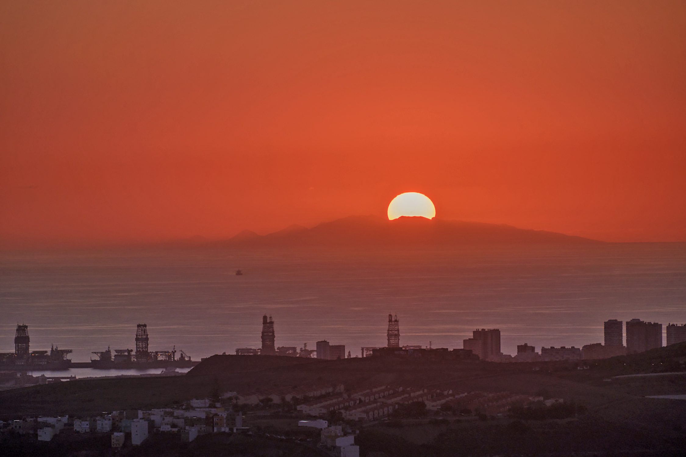 El Sol el pasado 16 de marzo de 2025 emergiendo justo detrás de la isla de Fuerteventura sobre el Macizo de Jandía, capturado desde la Montaña de Arucas, en Gran Canaria, a una distancia de 118 km. En primer plano se pueden ver algunas edificaciones de la ciudad de Las Palmas de Gran Canaria, seguido del Puerto de la Luz y de Las Palmas con sus estructuras portuarias destacándose contra el amanecer. Cámara Fujifilm X-T5 con objetivo Fujinon 70-300 mm a 160 mm f / 5,0 (equivalente a 240 mm en full frame), 1/2000 de segundo a ISO 125. Autor: Iván Cárdenes Muñoz.