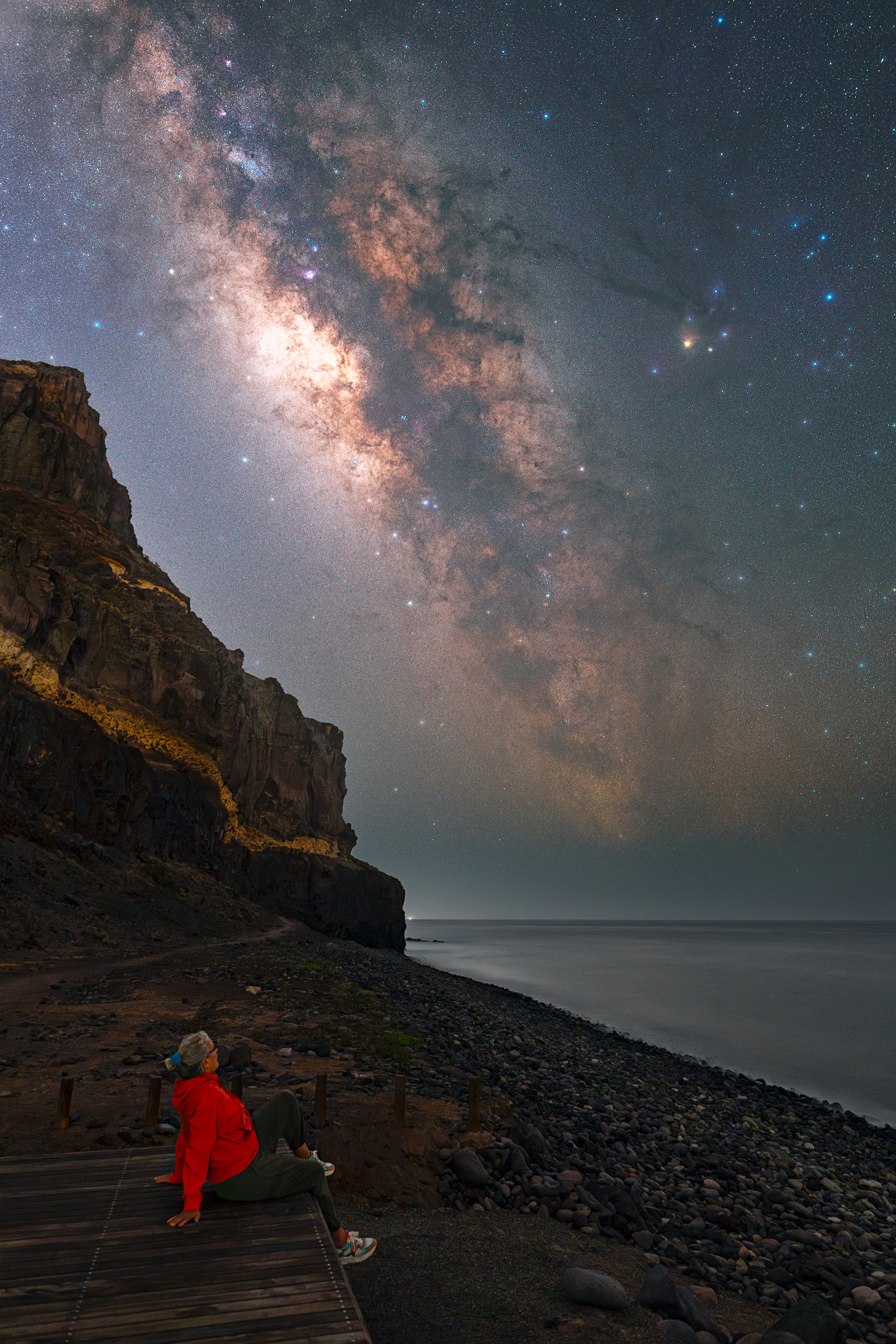 Marina Prol Franco, desde Gran Canaria, dice: «Aquí, mi madre contempla la Vía Láctea alzándose imponente sobre el mar en calma (…) Observar el firmamento bajo un cielo oscuro te enseña que la astronomía no solo se estudia… también se siente.» Para el suelo, una sola toma de 48 segundos, y para el cielo, doce tomas de 50 segundos, todas a ISO 1600 con objetivo de 20 mm f /2,8.