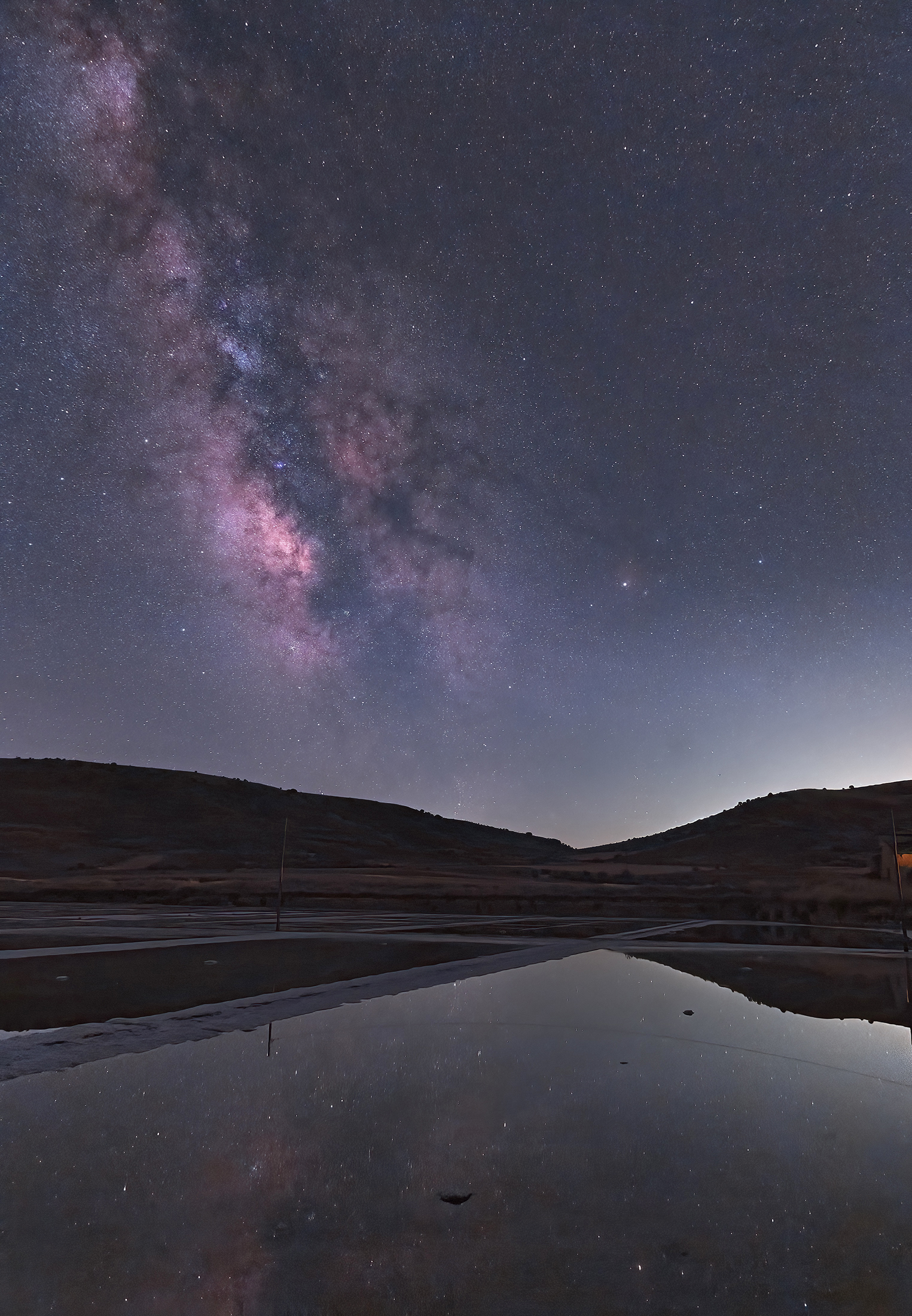 «Cuando te acercas a Imón (Guadalajara) para fotografiar la Vía Láctea sobre las Salinas nunca sabes si habrá suficiente agua o si hará viento que ensucie el espejo del agua, pero este día 26 de julio de 2025 se dieron unas buenas condiciones. Imagen resultante del apilado de ocho fotos de 12 segundos tomadas con cámara Canon 6D modificada, de rango completo, con objetivo Canon 24 mm f /3,5 a ISO 3200. Procesada con PixInsight y Photoshop.» Autor: Germán Penelas Pérez.