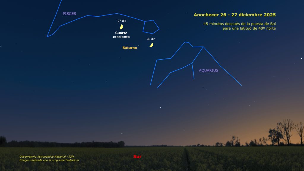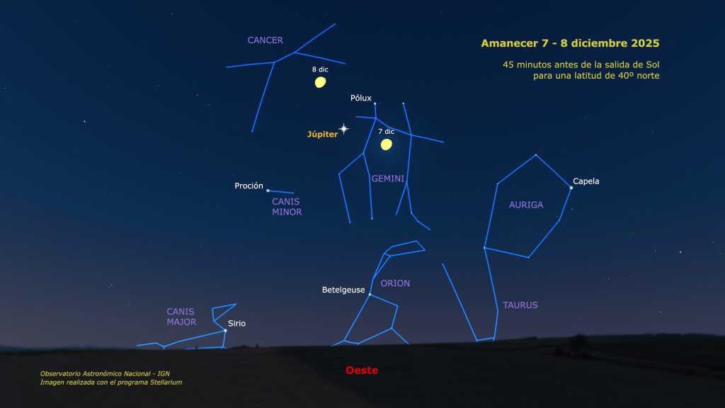 Los anocheceres de este mes nos brindan la oportunidad de observar los dos planetas más grandes del sistema solar en el cielo. Júpiter brilla durante toda la noche en la constelación de Géminis. Los días 7 y 8, recorrerá el cielo acompañado por nuestro satélite natural, que se acerca poco a poco a la fase llena. Por su parte, Saturno es visible entre las constelaciones de Acuario y Piscis, aunque con un brillo modesto. Podemos verlo durante la primera mitad de la noche. El día 26 de diciembre, la Luna estará en conjunción con el gigante de los anillos; al día siguiente, el 27, la Luna en cuarto creciente estará ya al otro lado del planeta.