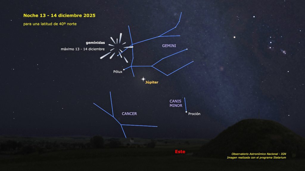 El mes de diciembre nos ofrece varias lluvias de meteoros. Entre el 4 y el 17 de diciembre pueden observarse las Gemínidas, una de las lluvias más intensas del año, que alcanzan su máximo la noche del sábado 13 al domingo 14. Es recomendable observarlas a partir de la medianoche, cuando el radiante, situado junto a la estrella Cástor de la constelación de Géminis, alcanza una mayor altura sobre el horizonte. Afortunadamente, este año la Luna en fase menguante muy avanzada no será un obstáculo para disfrutar de estos meteoros, ya que no sale hasta bien avanzada la madrugada.