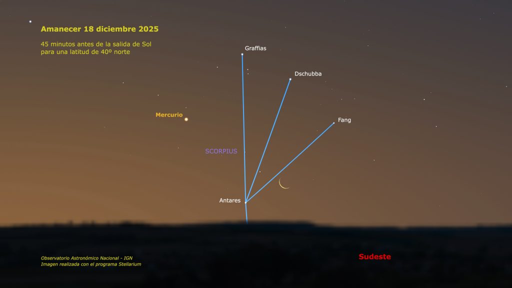 Este mes de diciembre nos ofrece una de las mejores oportunidades de 2025 para disfrutar de Mercurio, el más huidizo de los planetas. Lo podemos encontrar mirando hacia el sudeste al amanecer, y se ve especialmente bien durante la primera semana del mes. Entonces, se llega a elevar algo más de diez grados sobre el horizonte antes de que el brillo del Sol naciente lo deslumbre. En todo caso, es fundamental tener un horizonte limpio en esa dirección, sin ningún obstáculo que nos impediría ver a Mercurio. A diferencia de Mercurio, el otro planeta interno del Sistema Solar, Venus, se aprecia con gran dificultad a comienzos de mes al rayar el alba, ya que está notablemente más bajo que Mercurio, y se pierde en el brillo del alba a partir de la segunda semana de diciembre.
